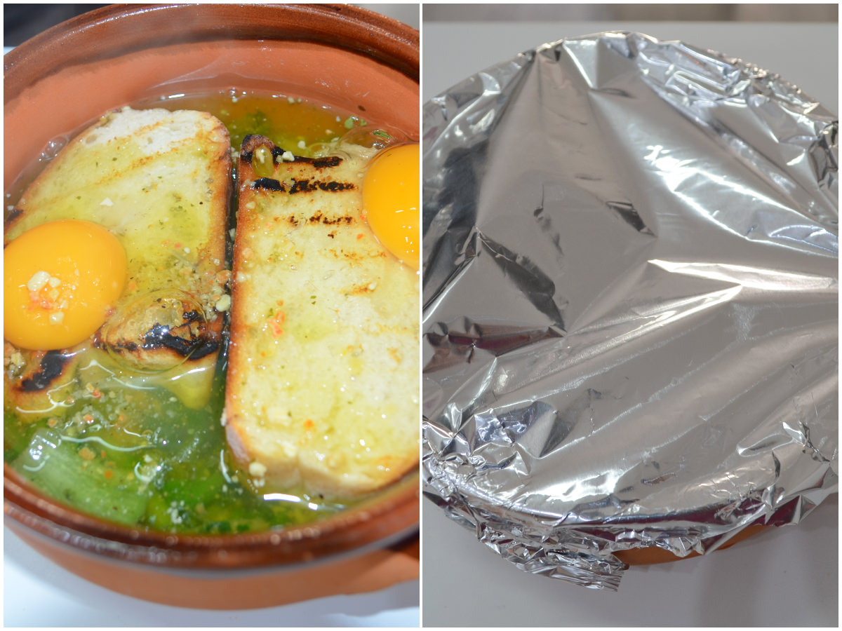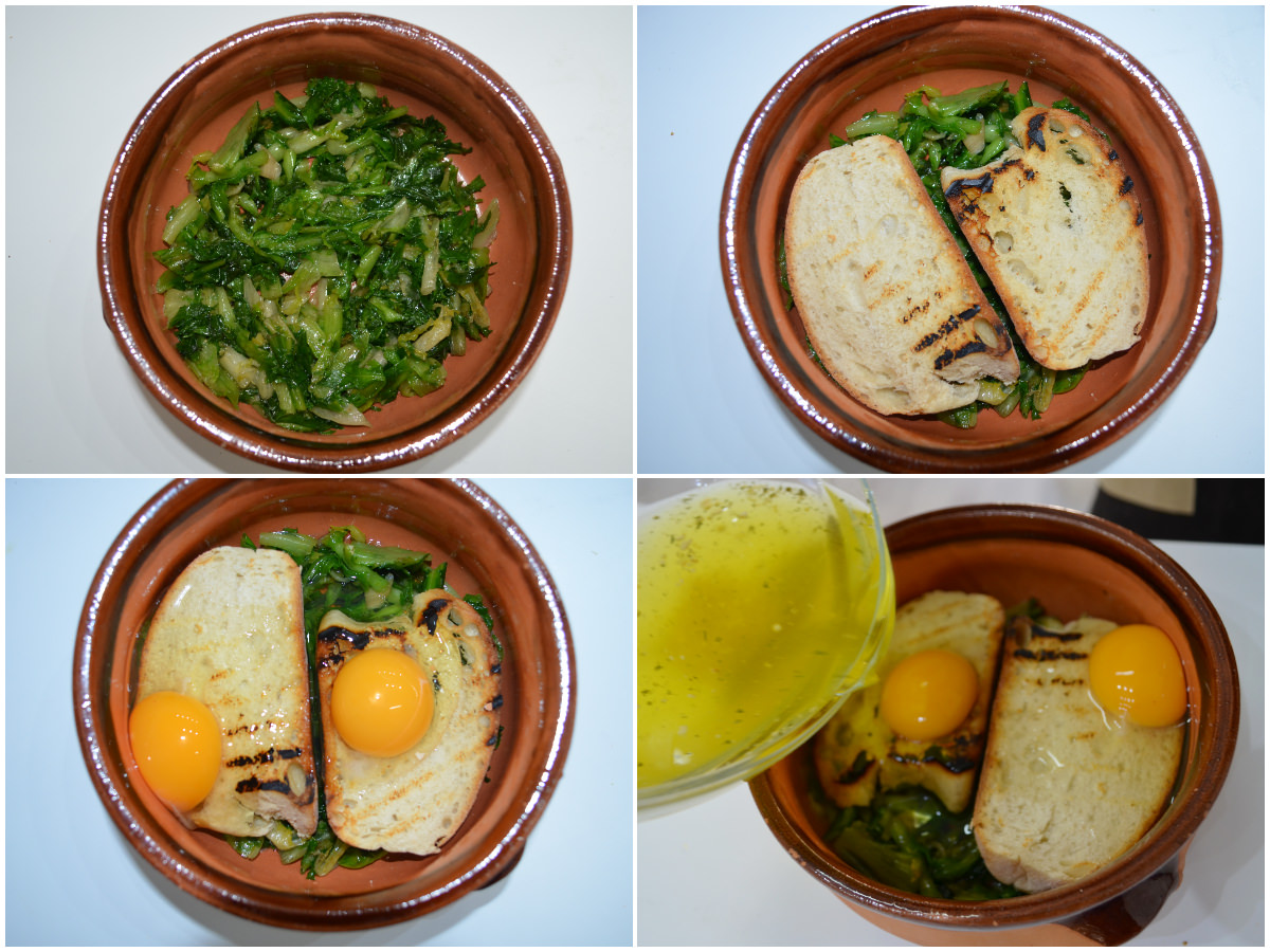 Coprite le scarole con il pane, mettete 1 uovo su ogni fetta di pane (facendo attenzione a non rompere il tuorlo), quindi aggiungete brodo caldo con dentro sciolto lo zafferano fino ad arrivare a filo con le uova.