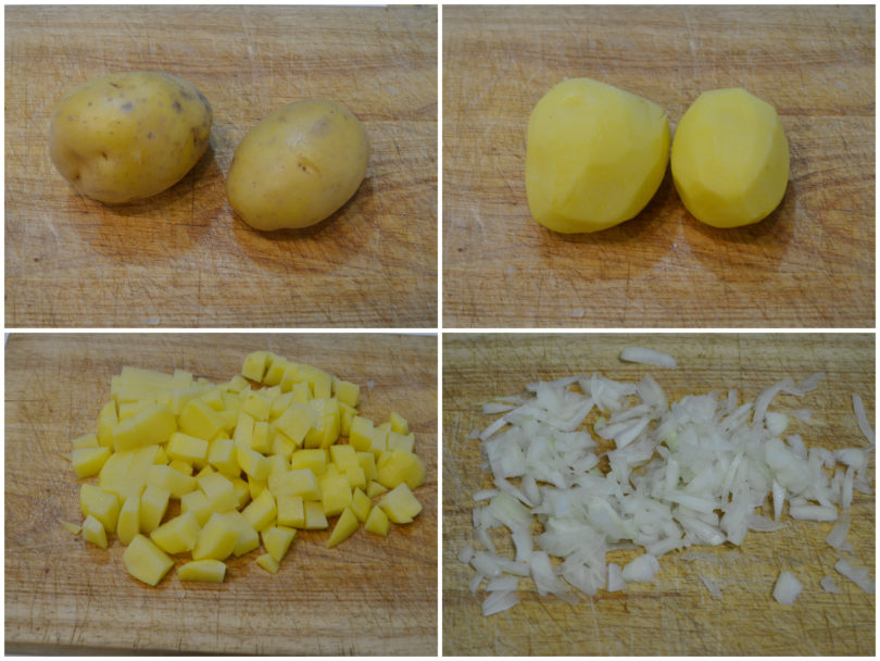 Pulite patate e cipolla, tagliate le prime a dadini e tritate la seconda.