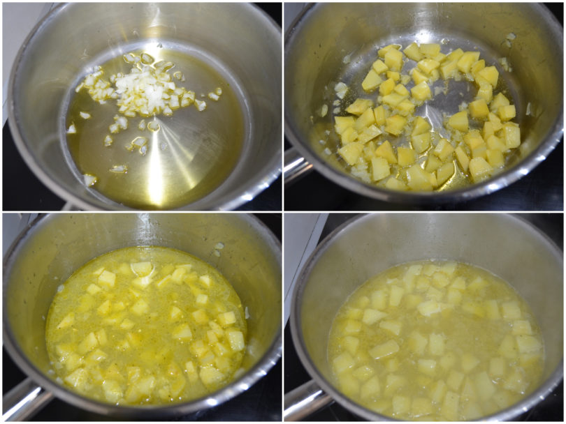 Fate dorare la cipolla in una casseruola con un po' di olio, poi aggiungete anche le patate.