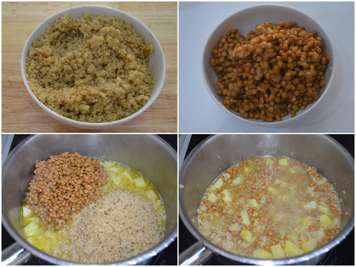 Poi unite quinoa e lenticchie nella pentola con le patate, mescolate, aggiustate di sale e continuate la cottura per altri 10 minuti.